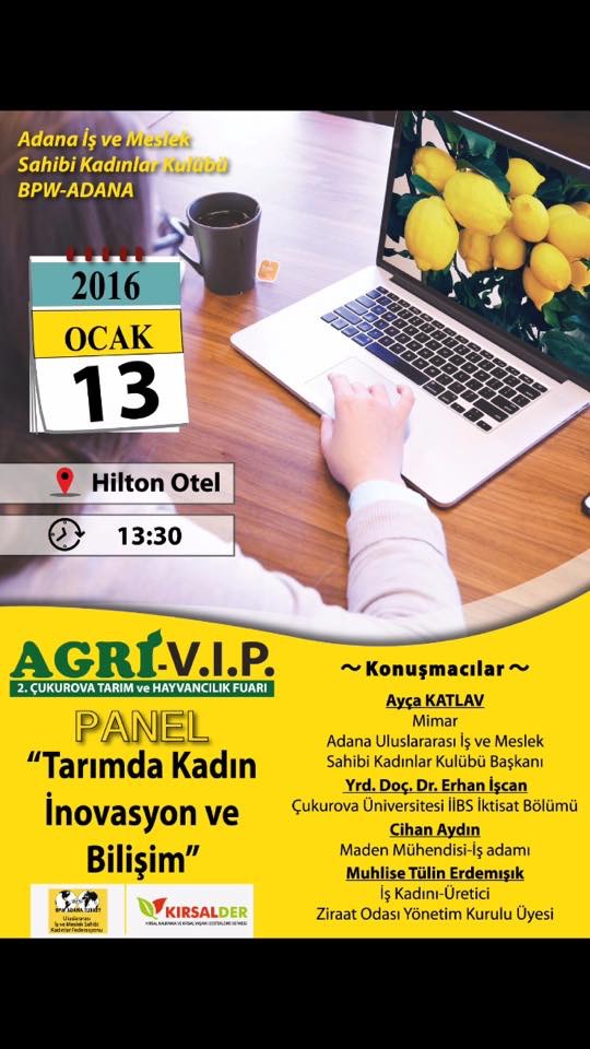Bu sene BPW Adana ve Agri Vip işbirliği ile 2. yapılacak olan Tarım ve Hayvancıllık Fuarına ve 13 Ocak saat 13.30 da BPW Adana Kulübü tarafından düzenlenecek olan "Tarımda Kadın, İnovasyon ve Bilişim" konulu panele davetlisiniz.