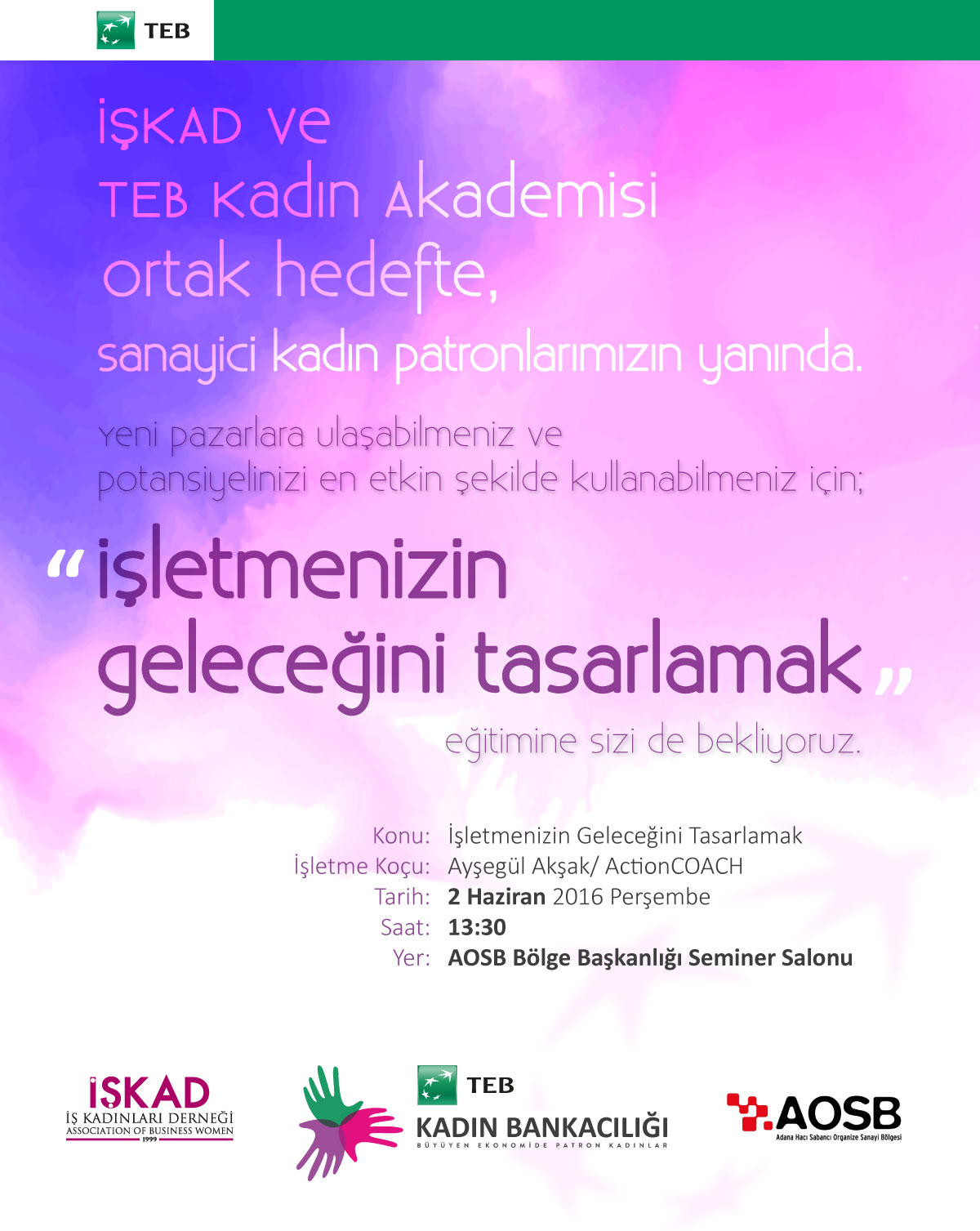 İŞKAD ve TEB Kadın Akademisi ortak hedefle "İşletmenizin Geleceğini Tasarlamak" adlı eğitimi 2 Haziran 2016 tarihinde saat 13:30 ' da Adana OSB Bölge Başkanlığı Seminer Salonunda gerçekleştirecektir.