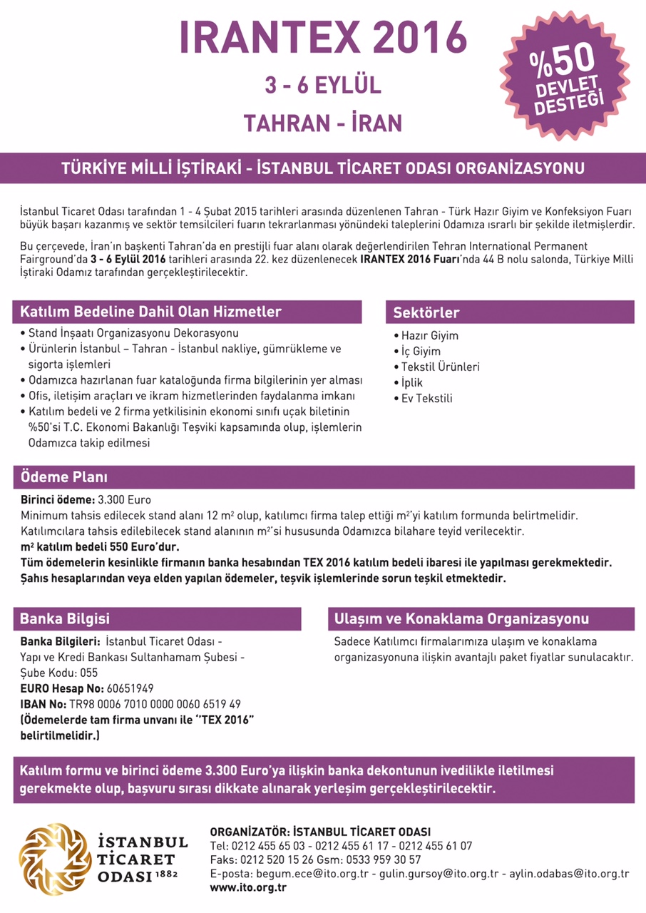 İstanbul Ticaret Odası (İTO) tarafından bildirilen yazıda, İran'ın başkenti Tahran'da en prestijli fuar alanı olarak değerlendirilen Tehran International Permanent Fairground'da, 3-6 Eylül 2016 tarihleri arasında 22. kez düzenlenecek İRANTEX 2016 Fuarı'nda 44B No'lu salonda Türkiye Milli İştiraki'nin gerçekleştirileceği belirtilmektedir.