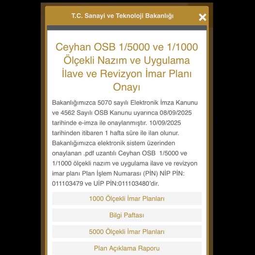 CEYHAN OSB BAKANLIK'TA ELE ALINDI.